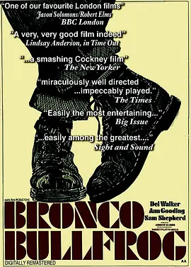 英国独立电影的经典作品,不知道为何很少被人提到,导演似乎也不太出名,最近出的DVD。喜欢MIKE LEIGH电影的人应该会同样喜欢这部吧。 Sam Shepard plays Irish prison escapee Jo Bronco Bullfrog. Hiding out in a seamy section of London's East End, Bullfrog befriends a gang of teenagers. Looking for kicks, the kids team up with Bullfrog, but his notion of excitement proves too much for them. Some good scenes, backed by excellent location photography, do not mitigate some of the more foolish aspects of the storyline. Completed in 1970, Bronco Bullfrog was withheld from general release for nearly two years. Set in the East End of London at the tail end of the 60s; BRONCO BULLFROG is the story of a young couple who decide to run away when their parents disapprove of their growing love for each other. They decide to hole up with Joe 'Bronco Bullfrog' who is in hiding after going on the run from Borstal. All three realise though that the law will catch up with them soon. Bronco Bullfrog is the first film Mike Leigh should have made. It is set in the East End and was filmed in six weeks in and around Stratford. Using young actors from Joan Littlewood's acting workshop, much of the film is improvised from the script thus giving the film an authenticity lacking in most other home grown efforts (see "Quadrophenia").